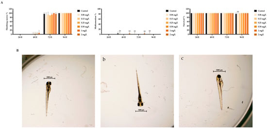 The fish embryo toxicity (FET) test was performed to assess the toxicity of the systems according to the OECD 236 guideline []. The day before the test, healthy and sexually mature males and females (2:1) were separated by a physical barrier in an aquarium. On the day of the test, the physical barrier was removed, and males and females were allowed to mate for 1 h. After that, fertilized eggs were collected and checked under a stereomicroscope (Stereoscopic Zoom Microscope—SMZ 1500, Nikon, Tokyo, Japan). Eggs with any malformations or non-fertilized eggs were discarded following the OECD 236 guideline. Three hours post-fertilization (hpf), zebrafish embryos were transferred to 24-well plates (1 egg per well in 2 mL of exposure media) and exposed to different concentrations of the various systems. Ten embryos and four internal controls were used per plate and three plates per concentration. A negative control (only fish system water (FSW), for validation purposes), a solvent control (DMSO (100 µ/L of FSW); whenever TMZ was tested), and a positive control (4 mg/L 3,4-dichloroaniline (3.4-DCA)) were always considered. TMZ drug was, in agreement with the manufacturer’s instructions, dissolved and prepared in DMSO solvent at a concentration of 1 g/L. According to the OECD recommendations regarding the maximum solvent volume, in each well plate the maximum TMZ concentration tested was 1 mg/L (5.2 µM). The development of the zebrafish eggs, embryos, and larvae was followed and observed daily under the Stereoscopic Zoom Microscope—SMZ 1500, Niko—during 96 h of exposure period to record the hatching success, malformations, and survival.