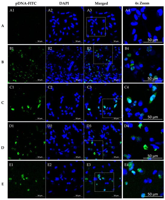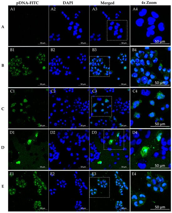 Fluorescence confocal microscopy study. Representative live cell images of SNB19 cells after 4 h of transfection mediated by the different peptide/pDNA complexes developed at N/P ratio of 1 (using 1 µg pDNA). DAPI dye stained the nuclei while FITC labeled pDNA green. Panels (A1–E1) indicate labeled pDNA-FITC, panels (A2–E2) show nuclei stained by DAPI, panels (A3–E3) correspond to merged images, and panels (A4–E4) present a 4× zoom of the highlighted regions. Non-transfected cells (A) and cells transfected with the developed complexes: WRAP5/pDNA-FITC (B), Tf-WRAP5/pDNA-FITC (C), TMZ/WRAP5/pDNA-FITC (D), and TMZ/Tf-WRAP5/pDNA-FITC (E). Scale bar = 50 μm.