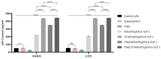 p53 protein levels in SNB19 and U373 cells after 48 h of transfection mediated by the different peptide/pDNA complexes developed at N/P ratio of 1 (using 1 µg pDNA). Data were obtained from six independent measurements (mean ± SD, n = 6) and analyzed by one-way ANOVA, followed by the Bonferroni test. **** p < 0.001; ** p < 0.021; ns—non-significant (p > 0.5).