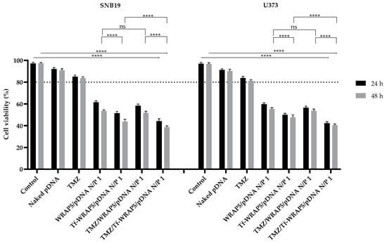 Cellular viability of SNB19 and U373 cells after 24 and 48 h of transfection mediated by the different peptide/pDNA complexes developed at N/P ratio of 1 (using 1 µg pDNA). Cells not transfected were used as a positive control and cells treated with naked pDNA and TMZ drug were used as controls. Data were obtained from six independent measurements (mean ± SD, n = 6) and analyzed by one-way ANOVA, followed by the Bonferroni test. The dotted line represents the limit accepted for a substance to be considered as non-cytotoxic. **** p < 0.001; ns—non-significant (p > 0.5).