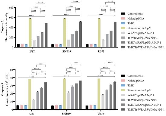 Caspase-3 and caspase-9 activities were assessed after 48 h of cellular transfection to assess the induction of apoptosis mediated by the nano-systems and determine which pathway is activated. In previous work, our research group reported the first results regarding the dual delivery of developed systems to U87 cells, as has been discussed []. Figure 13 includes new and complementary results regarding the U87 glioma cell line and summarizes the obtained results for the SNB19 and U373 cell lines studied in this manuscript. In U87 cells, all the complexes led to the activation of both caspase activities (**** p ≤ 0.0001). A remarkable difference was found between WRAP5/pDNA and TMZ/WRAP5/pDNA and Tf-WRAP5/pDNA and TMZ/Tf-WRAP5/pDNA complexes (**** p ≤ 0.0001). Furthermore, an accentuated difference was also noted between WRAP5/pDNA and Tf-WRAP5/pDNA and the complexes having TMZ, TMZ/WRAP5/pDNA, and TMZ/Tf-WRAP5/pDNA (**** p ≤ 0.0001). TMZ complexes were the ones inducing higher caspase activation. In SNB19 and U373 cells, transfection with the complexes also resulting in the activation of both caspases (**** p ≤ 0.0001). A statistical difference between complexes with and without Tf ligand (**** p ≤ 0.0001) and with and without TMZ (**** p ≤ 0.0001, ** p ≤ 0.01 in SNB19 cells for caspase-9 activity) was also noticed. Again, TMZ complexes were the ones inducing a greater extent of caspase activation.