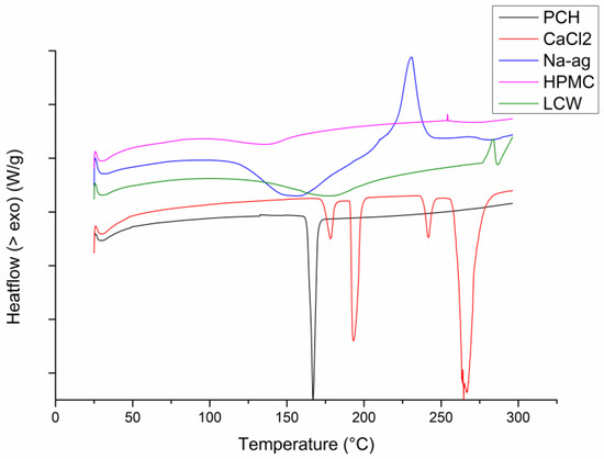 The DSC thermograms of PCH, CaCl2, Na-ag, HPMC, and LCW are depicted in Figure 2. PRO exhibited a sharp melting endothermic peak at 167.03 °C [39]. Thermograms of LCW and Na-ag showed an endothermic peak followed by an exothermic peak. A broad endothermic peak of Na-ag at about 154 °C may indicate water evaporation from the polymer. Loss of water at such a high temperature can be explained by the presence of strong ion-dipole bonds between –COO– groups of Na-ag and water molecules [29]. Further, a sharp exothermic peak was observed at 230 °C, probably due to polymer decomposition. The chitosan thermogram showed a broad endotherm peak with a maximum at about 178 °C, followed by a broad degradation exothermic event with the maximum at 283 °C. DSC thermograms of CaCl2 exhibited two sharp endothermic peaks at 178.67 °C and 267.10 °C. HPMC showed a broad endothermic peak at about 130 °C due to the loss of water or adsorbed moisture from the polymer. These findings are in line with previously reported data from DSC analyses [29,34,40].