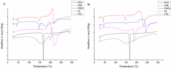 DSC thermograms of (a) PCH, physical mixture of PCH/CaCl2/Na-ag (FM2), physical mixture of PCH/CaCl2/Na-ag/LCW (FMC2), uncoated (F2), and coated (FC2) microparticles. (b) PCH, physical mixture of PCH/CaCl2/Na-ag/HPMC (FM6), PCH/CaCl2/Na-ag/HPMC/LCW (FMC6), uncoated (F6), and coated (FC6) microparticles.