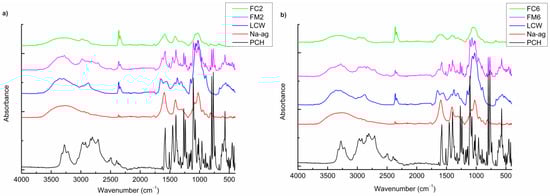FTIR spectra of (a) PCH, Na-ag, LCW, physical mixture of PCH/CaCl2/Na-ag (FM2), and coated microparticles (FC2), and (b) PCH, HPMC, Na-ag, LCW, physical mixture of PCH/CaCl2/Na-ag/HPMC (FM6), and coated microparticles (FC6).