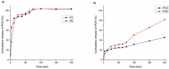 The drug release from polymer microparticles depends on penetration of the dissolution medium into microparticles, the swelling index and dissolution of the polymeric matrix, and dissolution of the drug after washing through the swollen matrix [30]. The in vitro release experiments of PCH microparticles were performed in two phases: first in simulated gastric medium (pH 1.2) and second in intestinal medium (pH 6.8). The results of the in vitro release study of PCH as a function of time from the uncoated and coated microparticles are presented in Figure 5a,b. It can be observed that 65.5 ± 3.4% of the drug was released from formulation F2 after only 5 min. Furthermore, after 15 min, 84.3 ± 2.0% of PCH was released. Complete release, i.e., 98.3 ± 5.3%, occurred after 90 min.