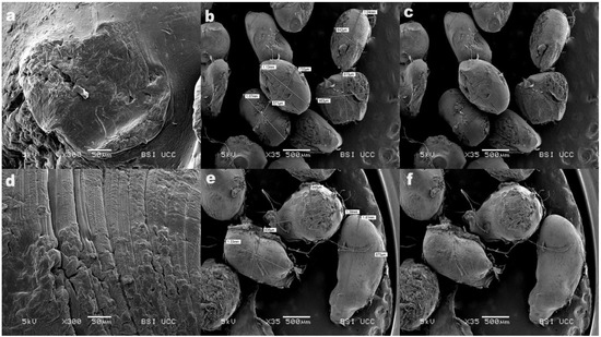 SEM micrographs of (a) FC2 microparticles (300×), (b) FC2 microparticles with dimensions (35×), (c) FC2 microparticles (35×), (d) FC6 microparticles (300×), (e) FC6 microparticles with dimensions (35×), and (f) FC6 microparticles (35×).