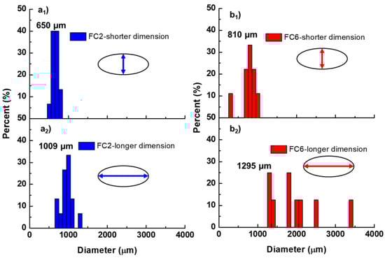 Microparticle size distribution histograms for longer and shorter dimensions, as shown in the inserts. (a1) FC2 microparticles measured at the shorter dimension. (a2) FC2 microparticles measured at the longer dimension. (b1) FC6 microparticles measured at the shorter dimension. (b2) FC6 microparticles measured at the longer dimension.