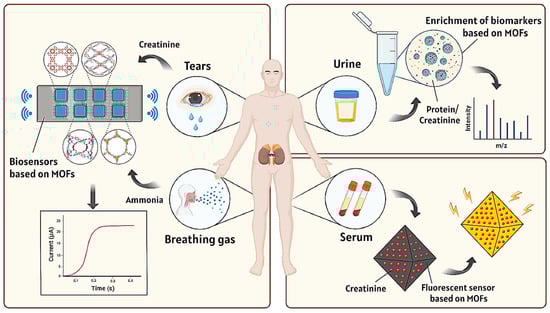 The main approach to diagnosing kidney diseases based on MOFs is to utilize the porous adsorption properties of MOFs to enrich biomarkers associated with kidney diseases. Biomarkers are usually abnormal in the early stages of the disease, which helps with early detection and improves the success rate of treatment. Different biomarkers can correspond to different types of diseases or different subtypes of the same disease, thus helping doctors develop more precise treatment plans. In addition, biomarkers can also predict disease progression, dynamically monitor changes in disease, and track treatment effects in real-time. In conclusion, the detection of biomarkers is crucial for disease management. MOFs are usually designed as biosensors for detecting various biomarkers related to kidney diseases in human biological samples (Figure 1).