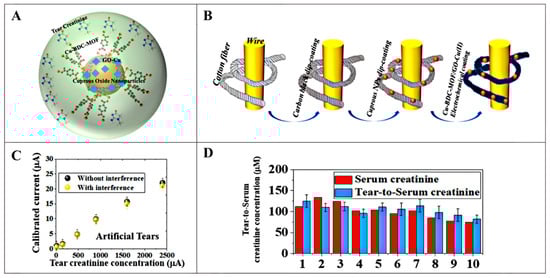 However, the determination of serum creatinine level not only requires a skilled technician to obtain a blood sample but also takes a long time to obtain the test result [68,69]. Fortunately, it has been reported that creatinine content in tears is positively correlated with blood creatinine levels, and thus, tears can be a good biomarker for assessing kidney function [70]. In recent years, wearable sensors have been greatly developed, and a fiber-based eyeglass sensing device for selective detection of tear creatinine has been invented [71]. The device combines copper-containing carboxylic acid (BDC) MOF with graphene oxide (GO)-Cu (II) and integrates it on cuprous oxide nanoparticles (Cu2O NPs), and the ternary complex of Cu-BDC MOF/GO-Cu(II)/Cu2O NPs was used for creatinine detection (Figure 6A,B). This design skillfully facilitated the diffusion of creatinine molecules from tear fluid into its porous structure and their permanent capture for noninvasive detection of serum creatinine. The composite sensor demonstrated excellent specificity, maintaining recognition efficiencies of up to 95.1% over the creatinine concentration range of 1.6 µM to 2400 µM, even in the presence of interfering agents such as dopamine, urea, and uric acid (Figure 6C). Through machine learning algorithms, the device was able to effectively differentiate between normal and abnormal (low, medium, and high) serum creatinine status based on tear creatinine levels with an accuracy of 83.3%. In practice, the eyewear sensor showed a low mean deviation between tear creatinine and serum creatinine values measured in clinical laboratories (Figure 6D), demonstrating its effectiveness in differentiating between patients with normal renal function and those with chronic kidney disease (creatinine concentration > 1000 µM). This miniaturized and portable ophthalmic detector greatly enhances the convenience of testing creatinine and follows the trend of telemedicine services, making personal health monitoring more autonomous and convenient.