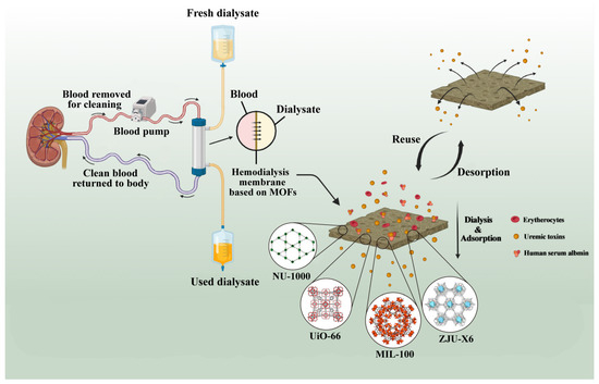 With the development of technology, the selectivity of dialysis membranes has improved, but convection and diffusion methods still have the drawbacks of inconvenience and cost [76]. Consequently, researchers have focused more on eliminating uremic toxins from patients’ blood by improving the adsorption ability of dialysis membranes. In a typical hemodialysis device, uremic toxins need to be removed through a dialysate regeneration process to use fresh dialysate [77]. Also, desorption of uremic toxins from dialysis membranes and regenerative reuse of dialysis membranes are necessary. The system of dialysate regeneration uses nanoporous adsorbents, which are typically necessary to achieve mobility in hemodialysis [78,79]. Novel porous nanomaterials of MOFs and their derivatives and complexes show great potential in uremic toxin adsorption. This means that the limitations of zeolites, composite membranes, activated carbon, and other traditional dialysis materials for adsorption have been overcome. The utilization of MOFs as uremic toxin adsorbents for the treatment of kidney diseases is shown in Figure 7.