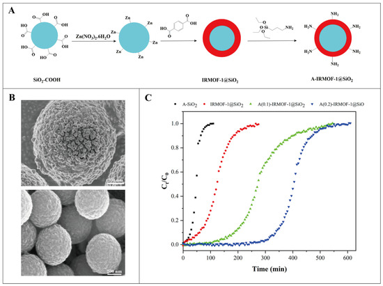 (A) Schematic diagram of the synthesis of IRMOF-1@SiO2 core-shell of amine functionalization. (Blue represents the core, red represents the shell.) (B) IRMOF-1@SiO2 SEM diagram, element mapping diagram. (C) IRMOF-1@SiO2 adsorption isotherm for creatinine. Reproduced from ref. [129] with permission from American Chemical Society, copyright 2023.