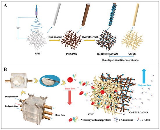 - Li, W.; Chao, S.; Li, Y.; Bai, F.; Teng, Y.; Li, X.; Li, L.; Wang, C. Dual-layered composite nanofiber membrane with Cu-BTC-modified electrospun nanofibers and biopolymeric nanofibers for the removal of uremic toxins and its application in hemodialysis. J. Membr. Sci. 2022, 642, 119964. [Google Scholar] [CrossRef]