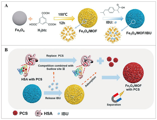 Studies have found that some PBUTs can be desorbed reversibly from HSA-PBUTs complexes. They represent that free toxins can be competitively adsorbed by adsorbents [132]. The non-steroidal analgesic ibuprofen (IBU) has the same serum albumin binding location as pCS, and the binding site affinity is greater between IBU and HSA. IBU can effectively replace PBUTs [133,134]. Chen et al. used an in-situ one-step method to encapsulate magnetic Fe3O4 nanoparticles on the porous MOF MIL-100(Fe) shell [98]. Then, the IBU was filled up into the pores to aquire a Fe3O4/MOF/IBU nano-removal agent with a core-shell structure with rich pores and good biocompatibility (Figure 13A). The IBU in the Fe3O4/MOF/IBU nano-remover is released after entering the blood flow and can be competitively adsorbed. Afterward, MOFs bind to free pCS via hydrophobic and classical interactions. Finally, the nano-remover containing pCS was magnetically separated from the blood to achieve efficient removal of PBUTs (Figure 13B). The removal rate of the Fe3O4/MOF/IBU nano-removal agent was around 26.7% when the initial concentration of pCS in the blood was 100 ppm. PBUTs in the blood can be eliminated using the displacement technology-based magnetic nano-remover, which also offers a dependable method of doing so.