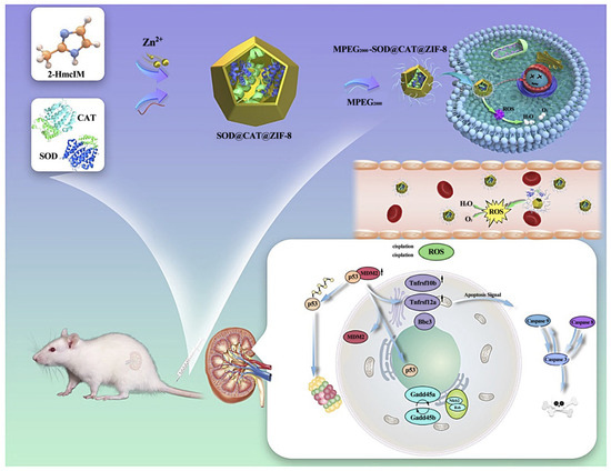 Natural antioxidant enzymes such as superoxide dismutase (SOD) and catalase (CAT) can be used as active oxygen scavengers [135,136], which may reduce excessive oxidative stress. The excessive oxidative stress is caused by excessive reactive oxygen species (ROS) in the serum of patients with acute kidney injury (AKI) [137]. It plays a therapeutic role in AKI. Hou et al. used the biomimetic mineralization approach to compress CAT and SOD in ZIF-8 and then fixed with MPEG2000-COOH to obtain a more stable and biocompatible MPEG2000-SOD@CAT@ZIF-8 (PSCZ) composite [138]. The transport of intracellular enzymes and the antioxidant effect were greatly enhanced when the composite material was employed as a stabilizing agent with antioxidant qualities for the cascade-based AKI comprehensive treatment. This MOF with dual-enzyme embedding allows for the co-delivery of SOD and CAT enzymes, which are efficient scavengers of reactive oxygen species (Figure 14). When it came to protecting mice from akik-related oxidative renal tissue damage, the integrated MPEG2000SOD@CAT@ZIF-8 (PSCZ) platform outperformed free CAT and SOD in terms of SOD and CAT enzymatic efficiency in vitro and improved ROS scavenging capabilities in vivo. To summarize, ‘plating’ based on ZIF-8 is an efficient enzyme protection technique that has a higher therapeutic efficacy and can help determine the exact medical treatment for AKI.