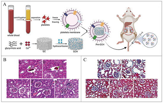 (A) Schematic diagram of Pm-GCH synthesis. Renal representative images with H&E staining (B) and Masson staining (C) after intravenous administration of PBS(a), GC(b), H(c), GCH(d), and Pm-GCH(e), respectively (black arrows, expanding the space of Bauman; green arrow indicates glomerular sclerosis). Reproduced from ref. [139] with permission from Authors, copyright 2021.
