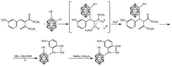 Then, 4 g (0.0083 mol) of isopropyl-o-carboranyl-m-nitrobenzylidenemalonate, 42.5 mL of glacial acetic acid, and 15.31 mL of hydrobromic acid were added to a 250 mL round-bottom flask equipped with a magnetic stirrer and reflux condenser. The mixture was heated to boiling overnight. At the end of the reaction, the mixture was cooled to room temperature. The resulting precipitate was filtered on a Schott filter and washed repeatedly with water. Next, the precipitate was dried and recrystallized in benzene. The product yield was 89%, m.p. 192–195 °C.