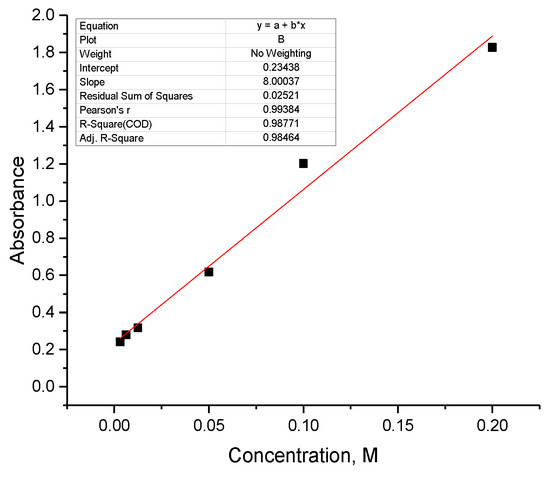 Amino groups were determined using acid orange (AO) dye according to the procedure described in [42]. In brief, NPs (0.085 g) were immersed in a 500 μmol/L AO solution (in HCl, pH = 3) for 12 h to allow the binding of the AO to the nanoparticle surface. Subsequently, nanoparticles were separated from the solution using a magnet and decanted. Desorption of each sample was conducted in 5 mL of NaOH solution (pH = 12) for 15 min on a shaker. Amino group concentration was quantified via spectrophotometric measurements at 495 nm using a calibration plot (Figure 4, R2 = 0.99).