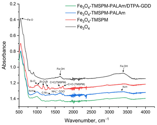 FTIR of Fe3O4 at different stages of modification and adsorption of DTPA-GDD.