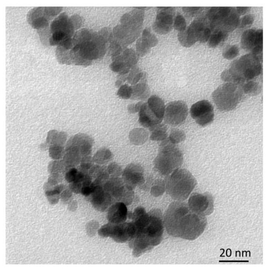 According to DLS analysis performed in PBS solution at 36.6 °C, the average diameter of the initial Fe3O4 NPs is 152 ± 15 nm, while that of the resulting NPs (Fe3O4-TMSPM-PAlAm/Gd-DTPA-GDD) is 173 ± 19 nm. The average size of NPs obtained by TEM is 25 nm for Fe3O4-TMSPM-PAlAm/Gd-DTPA-GDD, which is a much smaller value than the measured DLS. This is because DLS determines the hydrodynamic diameter and shows the degree of dispersion of NPs. In a real liquid, under the given conditions, NPs tend to form aggregates of several stuck-together particles. The TEM image is presented in Figure 7.