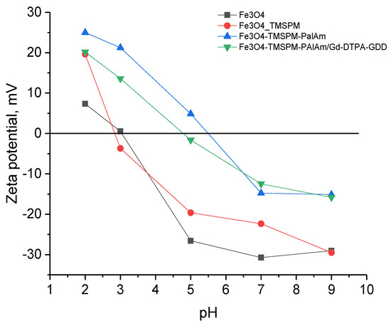 The next stage of modification was the graft polymerization of allylamine and its cross-linking using the TMPTMA agent. Based on the FTIR spectrum of the sample Fe3O4-TMSPM-PAlAm, NH groups are identifiable at 1650 and 3500 cm−1, while CH bonds were observed at 1385 cm−1. Following the immobilization of Gd-DTPA-GDD onto functionalized Fe3O4 NPs, the FTIR spectrometer was unable to detect any bonds at 2600 cm−1 (B-H). This is probably due to the fact that the concentration of DTPA-GDD is below the detection limit of the ATR-FTIR spectra. However, broad adsorption at 1600–1680 cm−1 was detected, which may be related to NH3+ of PAlAm and COO− bonds of Gd-DTPA-GDD, which indicates their interaction.