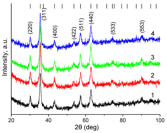 X-ray diffraction patterns of the obtained samples. 1—Fe3O4, 2—Fe3O4-TMSPM, 3—Fe3O4-TMSPM-PAlAm, 4—Fe3O4-TMSPM-PAlAm/Gd-DTPA-GDD.
