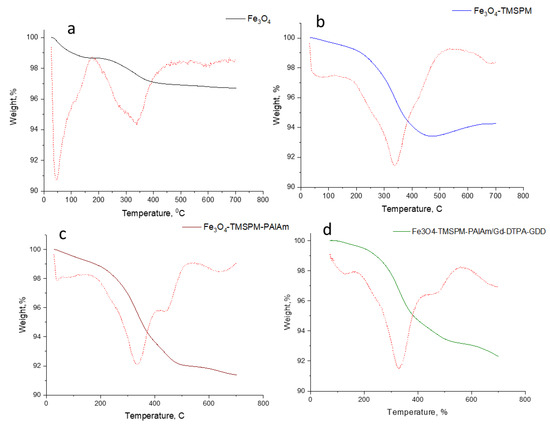 TGA analysis of Fe3O4 NPs at different stages of modification for Fe3O4 (a), Fe3O4-TMSPM (b), Fe3O4-TMSPM-PAlAm (c), and Fe3O4-TMSPM-PAlAm/Gd-DTPA-GDD (d) samples.