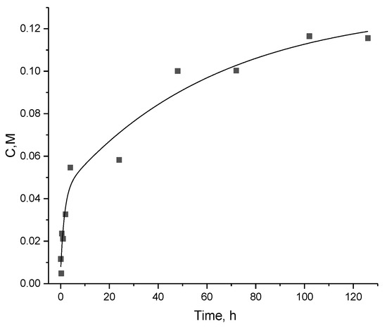One PBS tablet (Sigma-Aldrich, Merck KGaA, Darmstadt, Germany) was added to 100 mL of deionized water and dissolved. In 14 mL of this solution, 0.07 g of Fe3O4-TMSPM-PAlAm/Gd-DTPA-GDD was added. The sample remained on the shaker at 36.6 °C. The sample was taken out after 5, 10, 15, and 30 min, then after 1, 2, and 4 h. After this, the NPs were analyzed every 24 h for a week. The final analysis transpired 126 h post-initiation. The concentration of DTPA-GDD was evaluated by UV-vis spectroscopy (at 273 nm) using a calibration plot (Figure 3, R2 = 0.98464).
