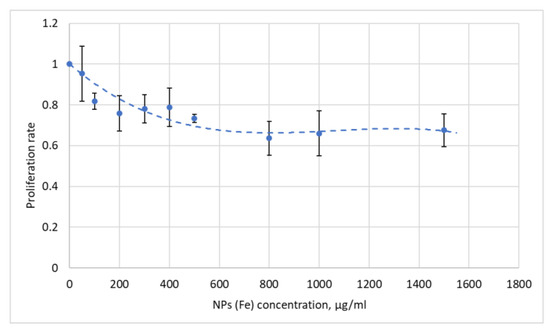 The cytotoxicity of nanoparticles was evaluated by their effect on cell proliferation. NPs showed tolerable toxicity towards T98 cells along the whole range of concentrations with less toxic concentrations up to 400 µg/mL of Fe (Figure 12), which allows planning further experiments to test NPs on animal tumor models, as therapeutic concentrations in the tumor tissues are declared as 20–30 µg/mL.