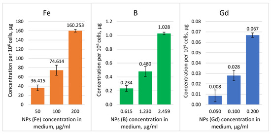 Fe, B, and Gd accumulation per 106 T98G cells after incubation with NPs.