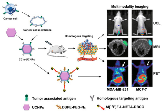 - Fang, H.; Li, M.; Liu, Q.; Gai, Y.; Yuan, L.; Wang, S.; Zhang, X.; Ye, M.; Zhang, Y.; Gao, M.; et al. Ultra-sensitive Nanoprobe Modified with Tumor Cell Membrane for UCL/MRI/PET Multimodality Precise Imaging of Triple-Negative Breast Cancer. Nano-Micro Lett. 2020, 12, 62. [Google Scholar] [CrossRef] [PubMed]