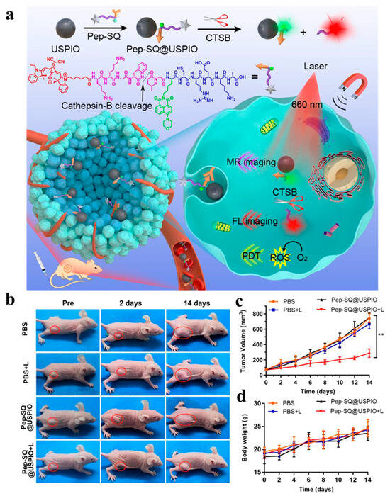 | PepSQ@USPIO | Cys-Arg-Glu-Lys-Ala (CREKA) | USPIO | SQ/USPIO | SQ | NIR/MRI | MDA-MB-231/MCF-7 | Balb/C-nude | [80] |