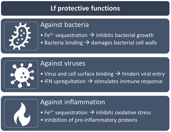 Lactoferrin, also known as lactotransferrin (Lf), is a mammalian, first-line defense, multifunctional protein belonging to the transferrin family, which displays the specific ability to bind ferric iron. It is constitutively expressed in mucosal surfaces and secretory fluids, primarily milk, but also in the digestive tract, bile, saliva, bronchial and nasal secretion, cervicovaginal mucus, seminal fluids, and tears [,]. In addition, Lf is promptly delivered by circulating neutrophils to sites of microbial invasion [].