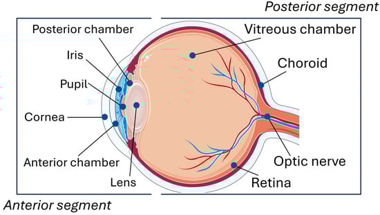 The eyeball can be divided into two distinct sections, an anterior and a posterior segment (Figure 3). The anterior segment encompasses the cornea, iris, ciliary body, lens, and the spaces known as the anterior and posterior chambers, which are filled with aqueous humor. The posterior segment is made up of the retina, choroid, optic nerve head, vitreous compartment, retinal pigment epithelium (RPE), and blood–retina barrier (BRB). The OSS is a morpho-functional unit, which is part of the anterior segment, and includes components functionally linked by the continuity of the epithelia, innervation and endocrine, and vascular and immune systems []. These components are the epithelia of the cornea and conjunctiva, tear film, eyelids, and lacrimal and meibomian glands.