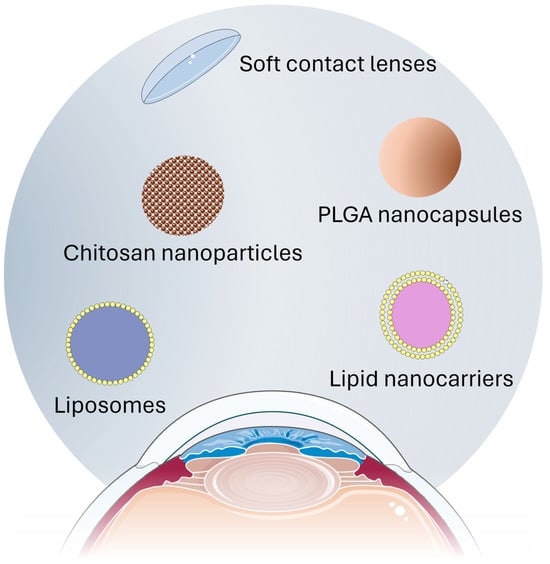 Topical administration is a widespread approach to treat the OSS as it does not cause pain to the subject and is easy to manage. Nevertheless, ocular therapies exhibit a rapid elimination process via the conjunctiva and nasolacrimal duct, leading to a short pre-corneal half-life of drugs, typically lasting only a few minutes. Consequently, frequent administration becomes necessary []. In this view, the use of controlled release strategies, such as nanotechnological carriers, contact lenses, and others, for delivering active principles has garnered significant attention in recent years (Figure 4 and Table 2). These innovative approaches enable the enhanced stability, permeability, and bioavailability of molecules, presenting notable advantages over conventional pharmaceutical forms [].