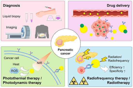 The use of radiofrequency ablation for treating inoperable PC is on the rise [123]. Nonetheless, the non-selective and invasive characteristics of current radiofrequency therapy may lead to patient discomfort. Nanoparticles can serve as a substitute for radiofrequency probes, selectively targeting tumor sites and reducing patient discomfort. Radio waves, unlike NIR-mediated PTT, can travel through objects with minimal absorption, hence they have enhanced biosafety [124]. The combination of AuNPs with radiofrequency fields in cancer treatment creates intense heat within the cells, leading to necrosis or cell death, with little to no harm to surrounding cells or tissues [125].