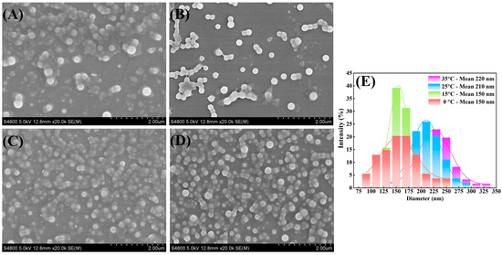 (A–D) SEM images of Cur-Pip nanoparticles assembled under different temperatures: (A) 35 °C, (B) 25 °C, (C) 15 °C, (D) 0 °C, and (E) the corresponding particle size distributions.