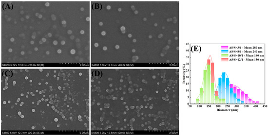 (A–D) SEM images of Cur-Pip nanoparticles assembled under various AS/S flow ratios: (A) 3/1, (B) 8/1, (C) 10/1, and (D) 12/1 and (E) the corresponding particle size distributions.