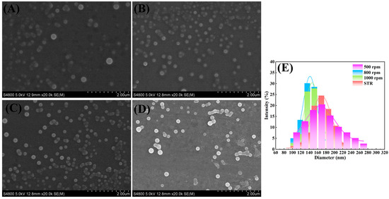 (A–C) SEM images of Cur-Pip nanoparticles assembled in the RPB at different rotating speeds: (A) 500 rpm, (B) 800 rpm, and (C) 100 rpm. (D) SEM image of Cur-Pip NPs prepared in the STR. (E) The corresponding particle size distributions.