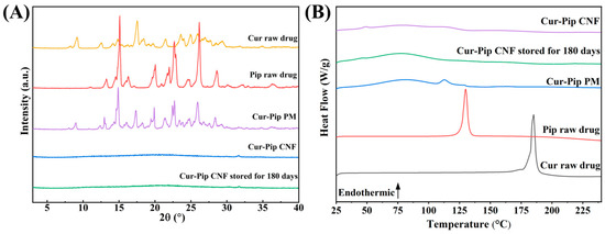 (A) XRD patterns of the Cur raw drug, Pip raw drug, Cur-Pip PM, Cur-Pip CNF, and Cur-Pip CNF stored for 180 days. (B) DSC curves of the Cur raw drug, Pip raw drug, Cur-Pip PM, Cur-Pip CNF, and Cur-Pip CNF stored for 180 days.