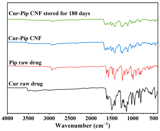 FTIR spectra of the Cur raw drug, Pip raw drug, Cur-Pip CNF, and Cur-Pip CNF stored for 180 days.