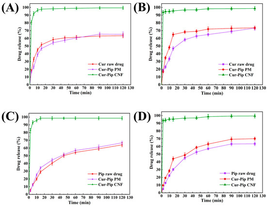 In vitro dissolution profiles of Cur in (A) HCl buffer (pH = 1.2) and (B) phosphate buffer (pH = 6.8). In vitro dissolution profiles of Pip in (C) HCl buffer (pH = 1.2) and (D) phosphate buffer (pH = 6.8).