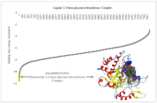 Molecular docking results of 1,3-beta-glucanosyltransferase (UniProt: A0A2H1A5Q4) from C. auris and the FDA-approved drug complex, including energy minimization. The arrow indicates the lowest binding affinity of −11 Kcal/mol. Yellow shade indicates the lowest binding affinity of ≤−10 Kcal/mol in ligands zinc000242548690 (digoxin), zinc000003932831 (dutasteride), zinc000052955754 (ergotamine), and zinc000203757351 (paritaprevir). The embedded protein–ligand complex is the 1,3-beta-glucanosyltransferase–dutasteride complex.
