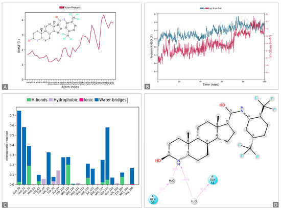 Molecular dynamics simulations of the 1,3-beta-glucanosyltransferase (UniPort: A0A2H1A5Q4)-and-dutasteride complex. (A): Ligand dutasteride fluctuations with respect to 1,3-beta-glucanosyltransferase. (B): Protein–ligand root-mean-square deviation (RMSD) of 1,3-beta-glucanosyltransferase and dutasteride. (C): Types of 1,3-beta-glucanosyltransferase–dutasteride interactions or “contacts” of 1,3-beta-glucanosyltransferase and dutasteride. (D): Dutasteride atom interactions with 1,3-beta-glucanosyltransferase and dutasteride.