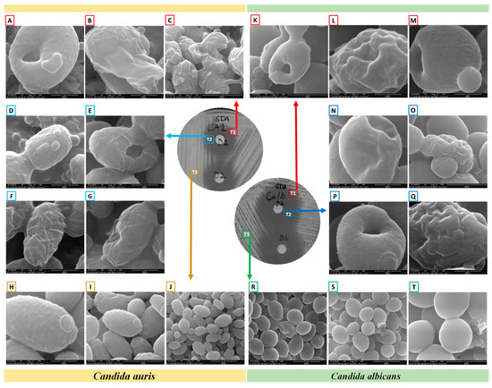 Morphology of C. albicans and C. auris under a scanning electron microscope after determining their antifungal susceptibilities to dutasteride. (A–C,K–M): Morphologies of Candida from the edge of the zone of inhibition (ZOI) [T1]. (A–C): Changes in the morphologies of C. auris from the edge of the ZOI [T1] after treatment with dutasteride. (D–G,N–Q): Candida cells from the ZOI [T2]. (D–G): Changes in the morphologies of C. auris from the ZOI [T2] after treatment using dutasteride. (H–J): Structure of C. auris from the area of standard growth [T3]. (K–M): Changes in the morphologies of C. albicans from the edge of the ZOI [T1] after treatment using dutasteride. (N–Q): Changes in the morphologies of C. albicans from the ZOI [T2] after treatment using dutasteride. (R–T): Structure of C. albicans from the area of standard growth [T3].