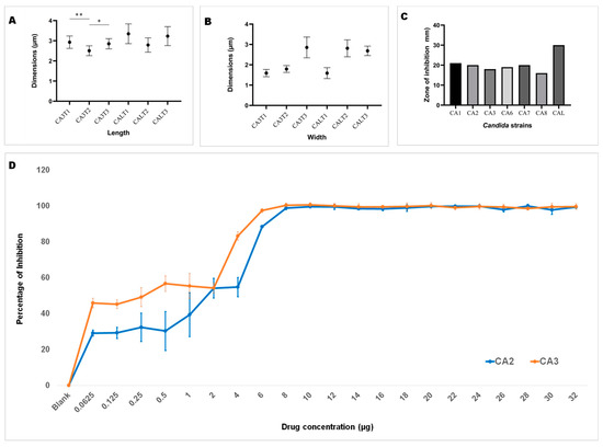 Length and width of C. auris and C. albicans. (A): Length of C. auris (CA3) and C. albicans (CAL) cells after treatment using dutasteride (CA3T1, CA3T2, CALT1, and CALT2) and cells without treatment, i.e., the control (CA3T3 and CALT3). * Significant at a p-value of <0.05; ** significant at a p-value of <0.01. (B): Width of C. auris (CA3) and C. albicans (CAL) cells after treatment using dutasteride (CA3T1, CA3T2, CALT1, and CALT2) and Candida cells without treatment, i.e., the control (CA3T3 and CALT3). (C): Observation of the zone of inhibition resulting from dutasteride treatment against C. auris and C. albicans. (D): Inhibition of biofilm formation of C. auris CA2 and C. auris CA3 clinical isolates by dutasteride. Graphs illustrate the percentage of biofilm formation inhibition by dutasteride against C. auris CA2 and C. auris CA3. All assays of biofilm formation inhibition were executed in quadruplicate in a 96-well plate. Error bars in the graphs designate standard errors.
