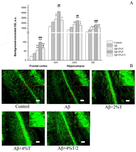 Autophagy activity was evaluated by an IHC analysis of autophagy marker LC 3-II in the brain areas. We evaluated the immunofluorescence of the LC3B antigen to examine the activity of autophagy in the frontal cortex and hippocampus. The results are summarized in Figure 1. The experimental groups significantly varied in LC3-II expression in all brain structures examined: frontal cortex [F(4, 10) = 13.78, p < 0.001], CA1 hippocampal area [F(4, 10) = 6.73, p < 0.01], CA3 hippocampal area [F(4, 10) = 9.21, p < 0.01], dentate gyrus (DG) [F(4, 10) = 14.51, p < 0.001]. Although there was a tendency to increase in autophagy activity in Aβ group compared to vehicle-treated i.c.v. controls in all the brain areas examined, a significant enhancement of the LC3-II expression was observed in the DG of the hippocampus (p < 0.05). An overall trend in increased LC3-II levels compared to the Aβ group was found in all the trehalose-treated groups. Nevertheless, only mice in the group treated with the highest dosage of trehalose (“Aβ + 4% T”, 4% trehalose solution daily) had significantly higher levels of LC3-II immunofluorescence than in the Aβ group in all the brain areas studied. Moreover, mice of the two other trehalose-treated groups were characterized by the reduced LC3-II expression compared to the “Aβ + 4% T” group. It is worth noting that the effect of the intermittent application of trehalose (“Aβ + 4% T/2”, 4% trehalose solution every other day) was markedly less than that of continuous treatment. Thus, a dose-dependent increase in the expression of autophagy marker LC3-II with trehalose treatment was revealed, with maximal efficiency for the continuous application of the 4% solution.