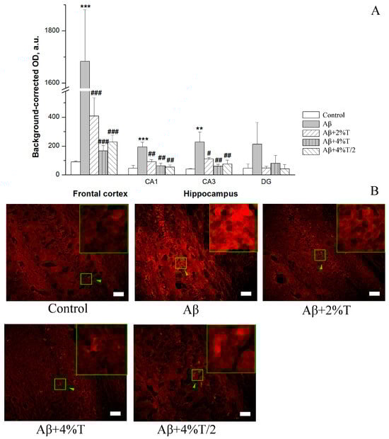 The effect of treatment with trehalose (2% or 4% solution daily (“Aβ + 2% T” or “Aβ + 4% T”) or 4% solution every other day (“Aβ + 4% T/2”), 14 days) on Aβ accumulation, quantified as immunofluorescence of Aβ in the brain of mice with Aβ-induced AD-like pathology. To set up the AD model, mice were given bilateral i.c.v. injections of Aβ25–35. The control group received vehicle (sterile water) i.c.v. injections. The treatment with trehalose was started 2 days after the i.c.v. Aβ25–35 administration. (A) Quantitative results. The data are expressed as the mean ± SEM of the values obtained in an independent group of animals (n = 3 to 4 per group). Statistically significant differences: ** p < 0.01, *** p < 0.001 vs. control group; # p < 0.05, ## p < 0.01, ### p < 0.001 vs. Aβ group. (B) Aβ immunofluorescence in the CA1 hippocampal area. The fluorescence images were finally obtained by an Axioplan 2 microscope. Magnification: ×200; scale bar (white rectangle), 50 μm. High zoom images of areas indicated by green arrows within green squares with intracellular Aβ load are shown in the insets.
