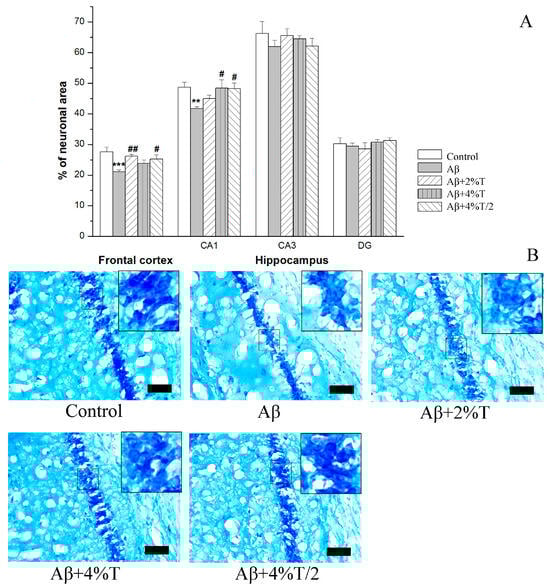 The effect of treatment with trehalose (2% or 4% solution daily (“Aβ + 2% T” or “Aβ + 4% T”) or 4% solution every other day (“Aβ + 4% T/2”), 14 days) on neuronal density, measured as the area occupied by Nissl-stained cells in the brain of mice with Aβ-induced AD-like pathology. To set up the AD model, mice were given bilateral i.c.v. injections of Aβ25–35. The control group received vehicle (sterile water) i.c.v. injections. The treatment with trehalose was started 2 days after the i.c.v. Aβ25–35 administration. (A) Quantitative results. The data are expressed as the mean ± SEM of the values obtained in an independent group of animals (n = 3 to 5 per group). Statistically significant differences: ** p < 0.01, *** p < 0.001 vs. control group; # p < 0.05, ## p < 0.01 vs. Aβ group. (B) Nissl-stained pyramidal neurons in the CA1 hippocampal area; scale bar (black rectangle), 50 μm. High zoom images of areas within small squares with Nissl-stained pyramidal neurons are shown in the insets.