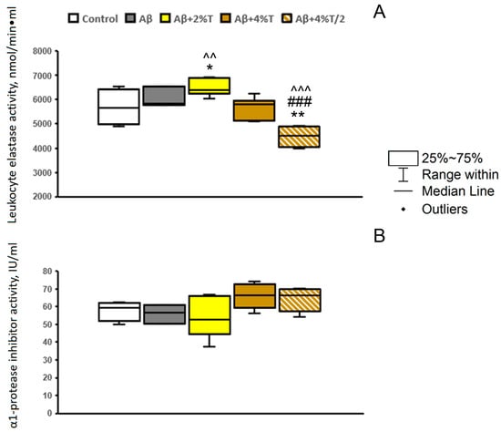 The effect of treatment with trehalose (2% or 4% solution daily (“Aβ + 2% T” or “Aβ + 4% T”) or 4% solution every other day (“Aβ + 4% T/2”), 14 days) on LE activity (A) and α1-PI activity (B) in the serum in mice with Aβ-induced AD-like pathology. To set up the AD model, mice were given bilateral i.c.v. injections of Aβ25–35. The control group received vehicle (sterile water) i.c.v. injections. The treatment with trehalose was started 2 days after the i.c.v. Aβ25–35 administration. The data are expressed as the median and interquartile range (Q1; Q3) of the values obtained in an independent group of animals (n = 3 to 6 per group). Statistically significant differences: * p < 0.05, ** p < 0.01 vs. control group; ### p < 0.001 vs. Aβ group; ^^ p < 0.01, ^^^ p < 0.001 vs. “Aβ + 4% T” group.