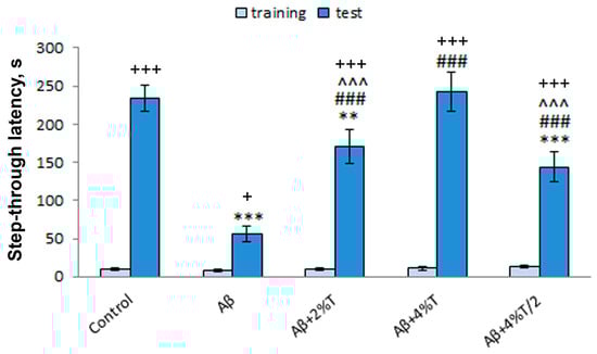 The effect of treatment with trehalose (2% or 4% solution daily (“Aβ + 2% T” or “Aβ + 4% T”) or 4% solution every other day (“Aβ + 4% T/2”), 14 days) on cognitive function (passive avoidance learning) in mice with Aβ-induced AD-like pathology. To set up the AD model, mice were given bilateral i.c.v. injections of Aβ25–35. The control group received vehicle (sterile water) i.c.v. injections. The treatment with trehalose was started 2 days after the i.c.v. Aβ25–35 administration. The data are expressed as the mean ± SEM of the values obtained in an independent group of animals (n = 6 per group). Statistically significant differences: + p < 0.05, +++ p < 0.001 vs. the values of the same group on training day; ** p < 0.01, *** p < 0.001 vs. control group; ### p < 0.001 vs. Aβ group; ^^^ p < 0.001 vs. “Aβ + 4% T” group.